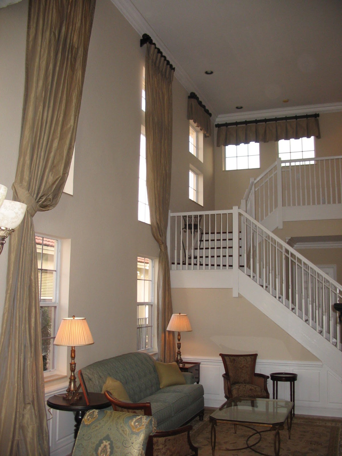 When you’re working with two-story windows, scale is everything! For this project, I created custom drapery panels featuring an oversized champagne flute heading to ensure the design stood out perfectly against the height.